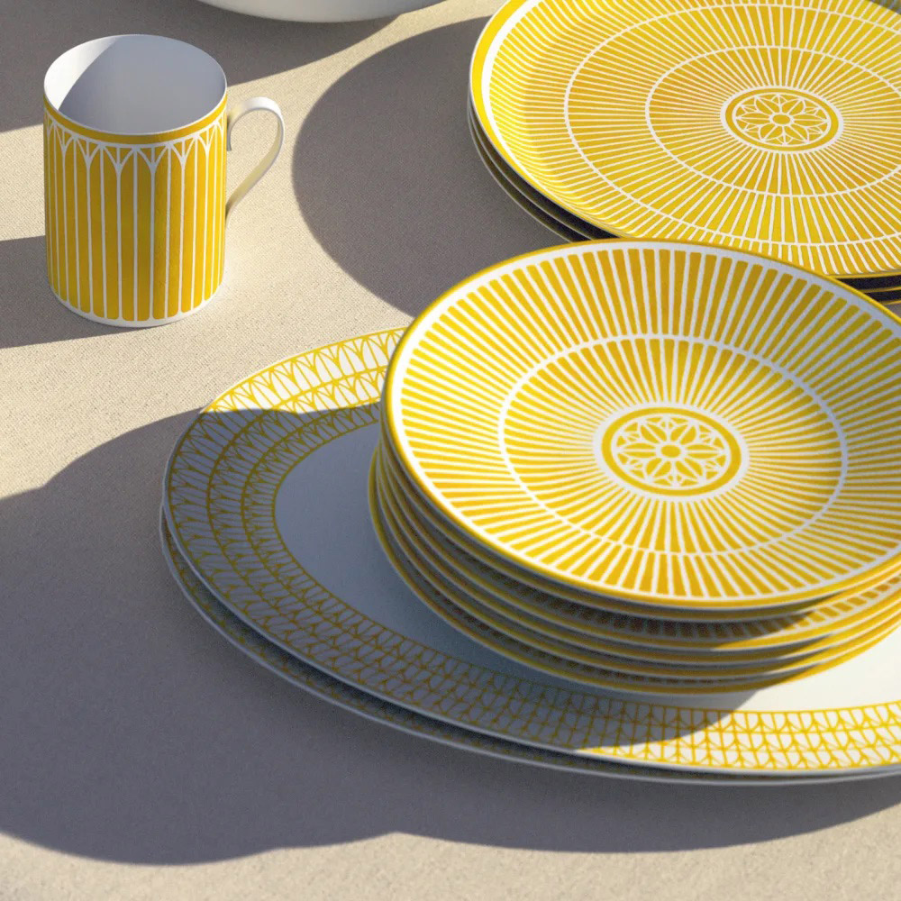 Malmaison Riviera collection reimagines the refined, timeless elegance of Christofle's Malmaison collections with a sunlit aura. Featuring around fifteen pieces in fine porcelain, ranging from plates, presentation platters, bowls, mugs, and tea and coffee cups to cake service pieces. It is complemented by silver-plated table accessories such as napkin rings, knife rests, place card holders, and coasters. The collection is adorned with signature motifs including palmettes, rosettes, and radiant rays. Each piece captures the Mediterranean light, enhanced by a delicate vibrant and natural watercolor yellow, designed to illuminate the table.