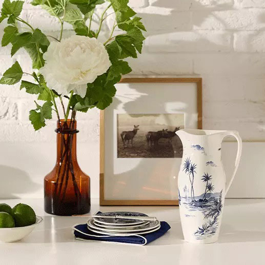The Vues d'Orient pattern appears in a brand new form: the pitcher. Ideal as a centrepiece for your table, or repurposed as a pretty vase, the Les Dépareillées blue pitcher is an elegant and contemporary decorative item. Also available in Les Dépareillées green collection.