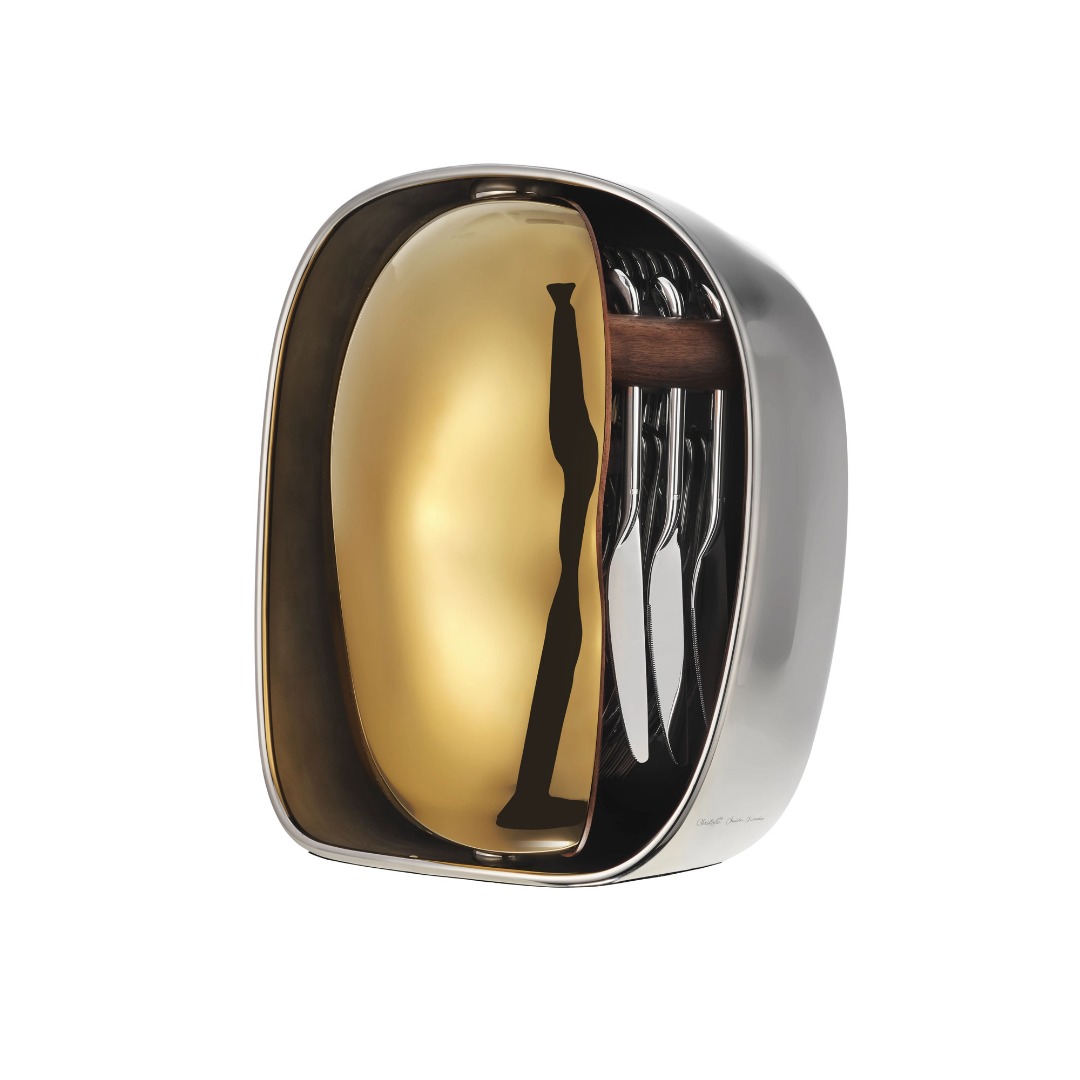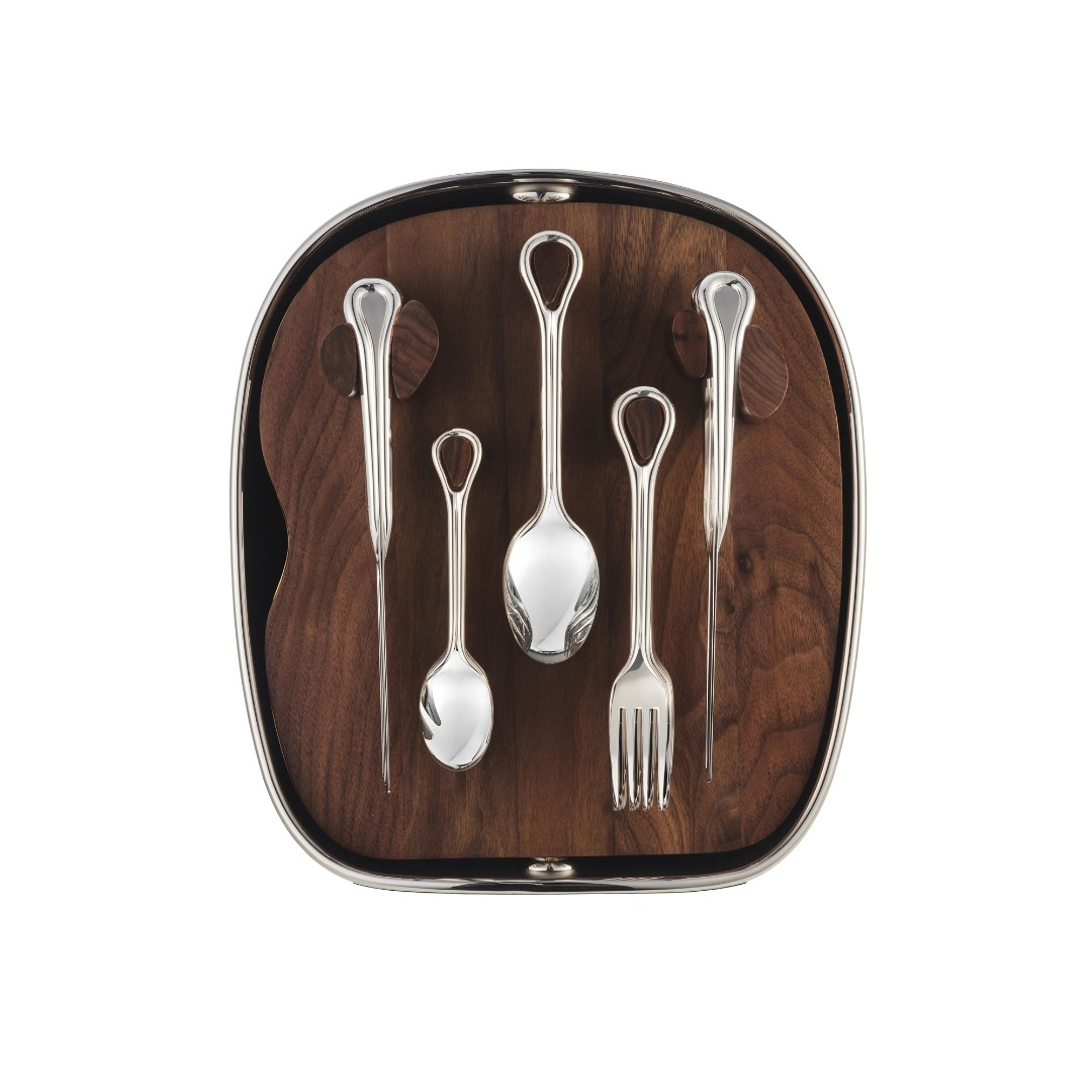 Cet écrin d'exception, objet à part entière défini par une surface bicolore, s'apparente à une porte ouvrant sur une pièce secrète. L'intérieur dévoile un tableau en noyer accueillant les couverts en métal argenté (6 fourchettes de table, 6 couteaux de table, 6 cuillères à soupe et 6 cuillères à dessert), rangés à la verticale grâce à un ingénieux système de patères, inspiré des formes planes de Jean Arp. Au-delà de sa force artistique et prouesse technique, la drop – partie ajourée – du couvert devient alors fonctionnel pour trouver sa place dans l'écrin, comme un jeu de sculpture mobile. L'ouverture génère une cinématique comme celle d’un carrousel en rotation et aussi précis qu’un mécanisme d’horlogerie. L'objet transcende sa fonction : il expose, protège, sublime.