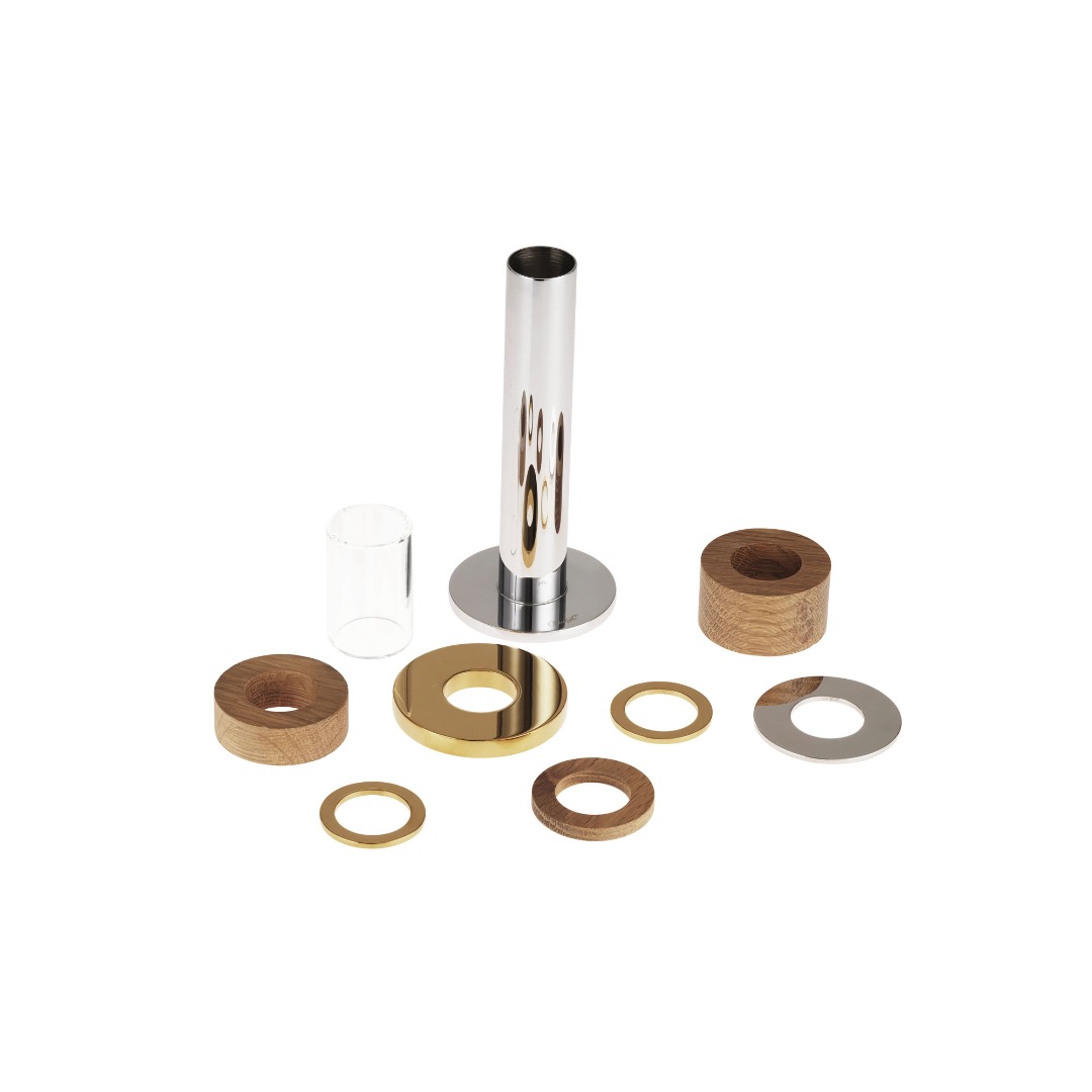 Ce bougeoir au design graphique capte tous les regards grâce à un jeu de contrastes entre formes et matières. Modulable à l’infini, il se réinvente selon l’ordre donné à ses éléments amovibles et invite à en réunir plusieurs pour créer une composition unique.